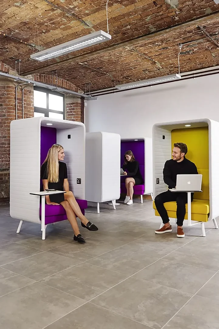 - Soundproof phone box-style pods (acoustic pods).